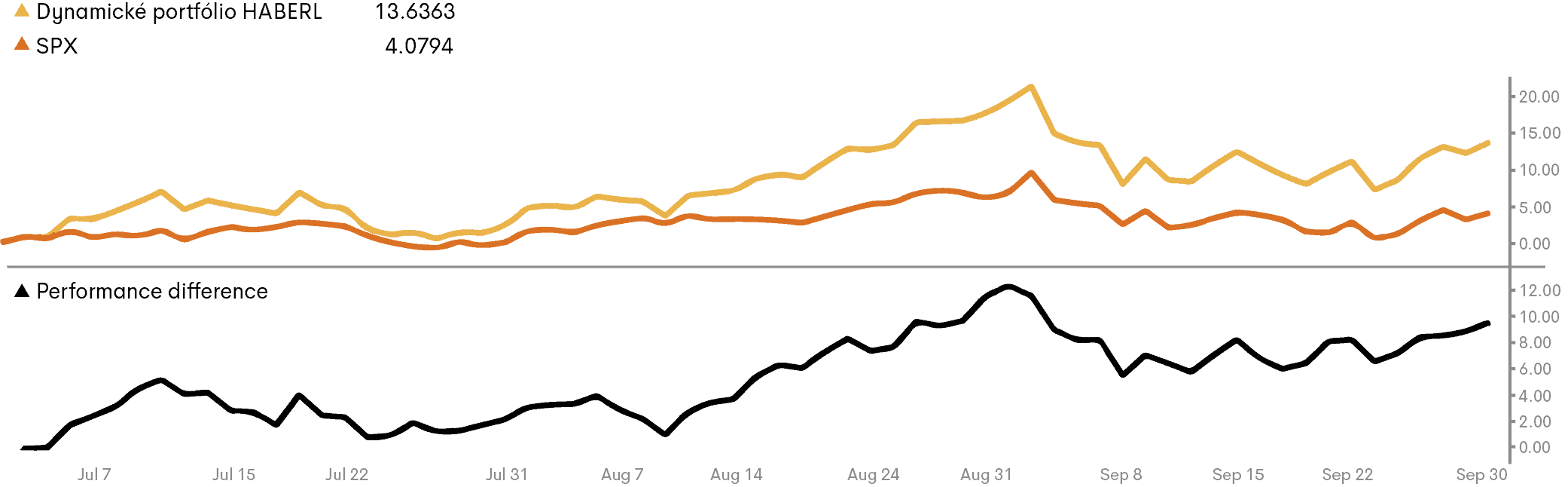 Hodnota portfólia sa za obdobie od 1.7.2020 do 30.9.2020 na percentuálnej báze zvýšila v mene EUR o 13,6% (v mene USD o 18,3%). V porovnaní s Benchmarkom (index S&P 500) vytvorilo Dynamické portfólio za uvedenú časovú periódu rozdiel vo výnosoch („Alpha“) na úrovni +9,5%.