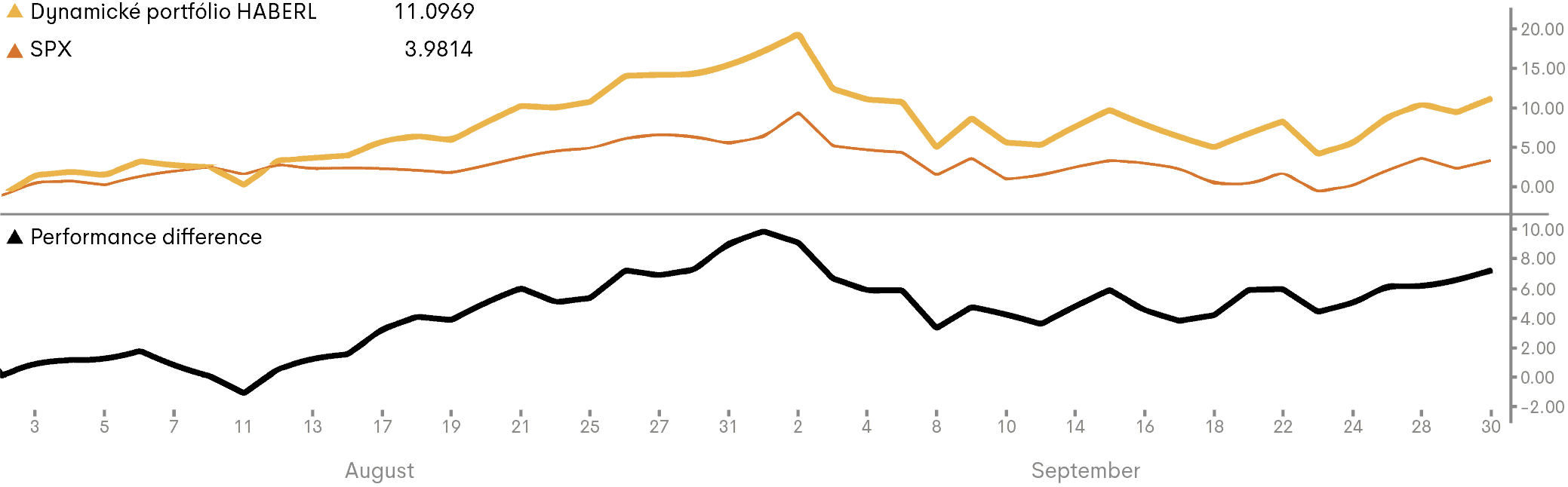 Hodnota portfólia sa za obdobie od 1.8.2020 do 30.9.2020 na percentuálnej báze zvýšila v mene EUR o 11,1% (v mene USD o 10,2%). V porovnaní s Benchmarkom (index S&P 500) vytvorilo Dynamické portfólio za uvedenú časovú periódu rozdiel vo výnosoch („Alpha“) na úrovni +7,1%.