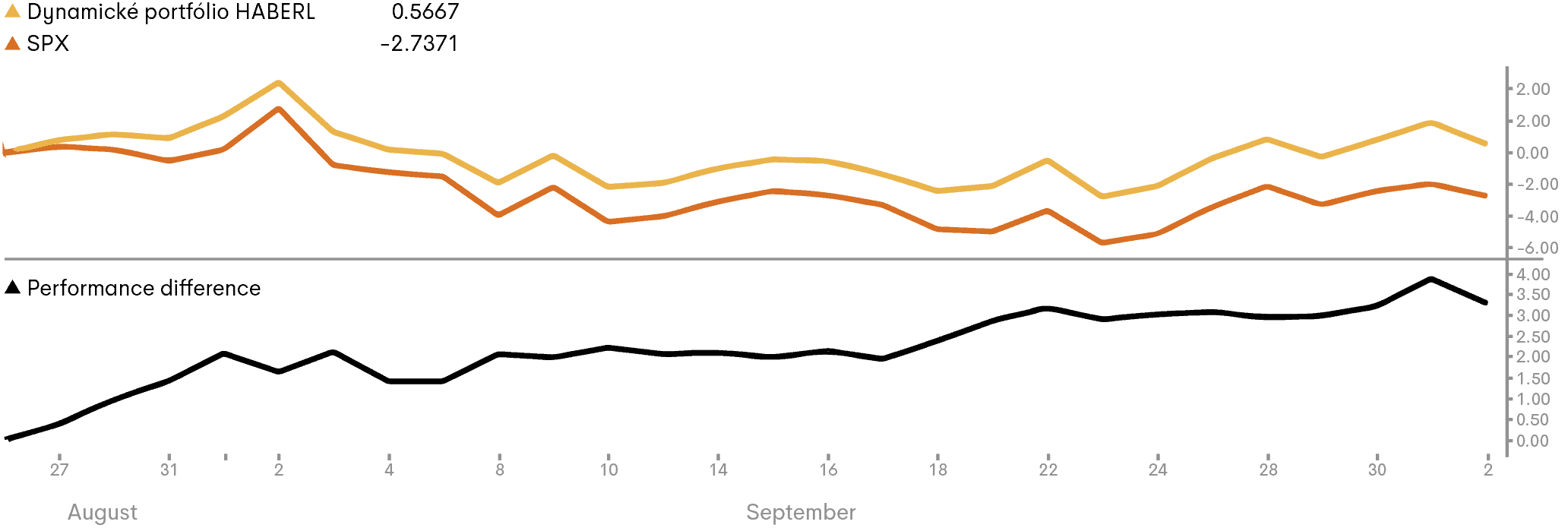 Hodnota portfólia sa za obdobie od 26.8.2020 do 30.9.2020 na percentuálnej báze zvýšila v mene EUR o 0,6% (v mene USD o – 0,3%). V porovnaní s Benchmarkom (index S&P 500) vytvorilo Dynamické portfólio za uvedenú časovú periódu rozdiel vo výnosoch („Alpha“) na úrovni +2,1%.
